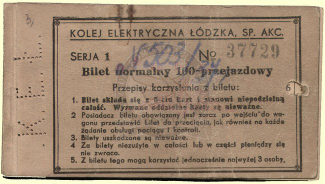 Bilet normalny 100 przejazdowy K.E.£. wprowadzony do obiegu 5 marca 1936 roku w cenie 20 z³.