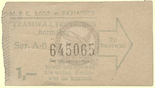 Bilet jednorazowy normalny w obiegu w latach 1970 - 1980 ważny na terenie miasta Pabianic.