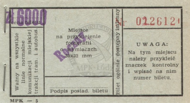 Bilet roczny imienny ważny na normalnych liniach tramwajowych i autobusowych na terenie jednego miasta