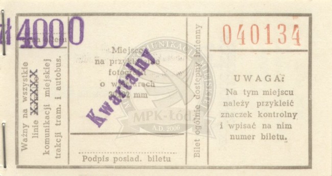 Bilet kwartalny imienny na wszystkie linie normalne i pośpieszne tramwajowe i autobusowe na terenie całej sieci MPK w województwie
