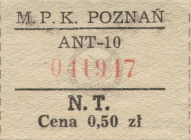 Bilet normalny z automatu typu "KRAB" z nadrukiem "MPK Poznań" Po raz pierwszy takie automaty zainstalowano na linii tramwajowej nr "12" 20 lutego 1966 roku.