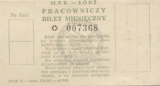 Bilet pracowniczy miesięczny o nieograniczonej liczbie przejazdów ważny na dwie linie tramwajowe lub jedną autobusową - cena: 25 zł.