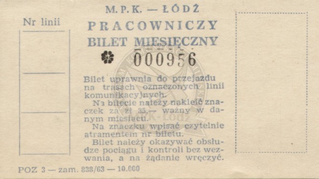 Bilet pracowniczy miesięczny o nieograniczonej liczbie przejazdów ważny na trzy linie w tym przynajmniej jedną autobusową - cena: 35 zł.