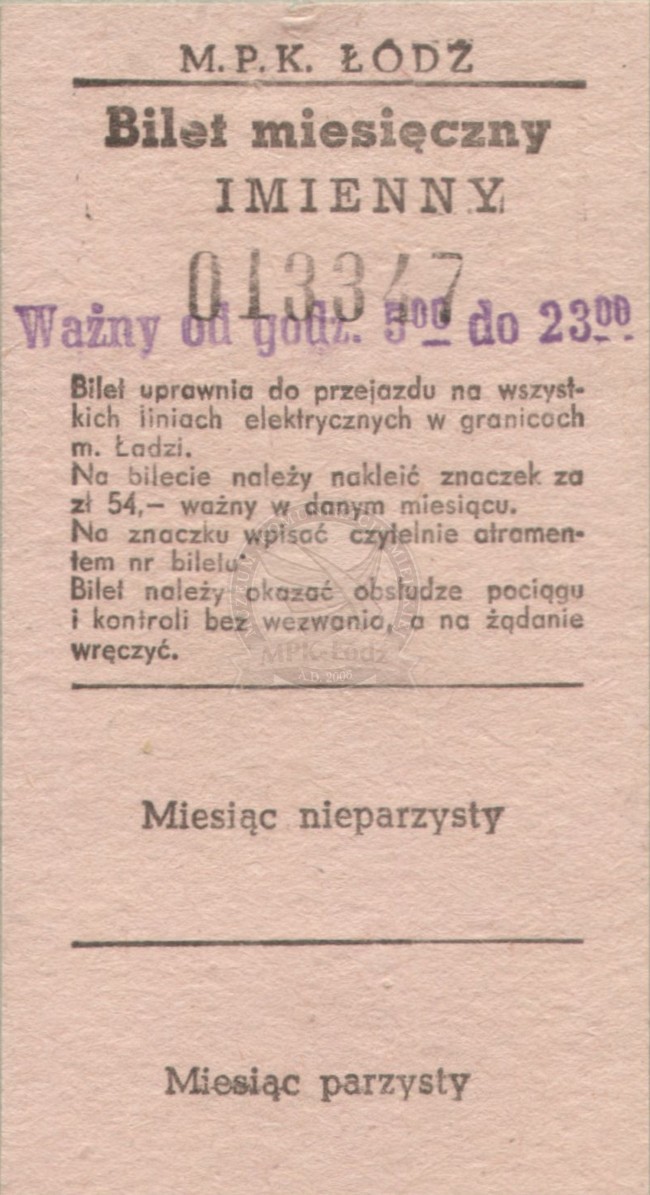 Bilet miesięczny imienny ważny na wszystkie dzienne linie tramwajowe w granicach miasta Łodzi - cena: 54 zł.