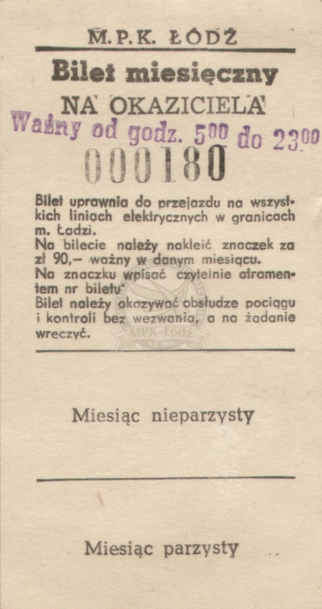 Bilet miesięczny na okaziciela ważny na wszystkie dzienne linie tramwajowe w granicach miasta Łodzi - cena: 90 zł.