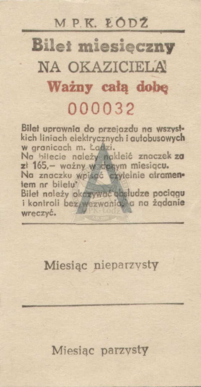Bilet miesięczny na okaziciela ważny całą dobę na wszystkie linie komunikacyjne w granicach miasta Łodzi - cena: 165 zł.