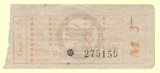 Bilet normalny jednorazowy na linię podmiejską do sprzedaży przez konduktora ważny na strefę miejską i trzy podmiejskie - cena: 2,75 zł.
