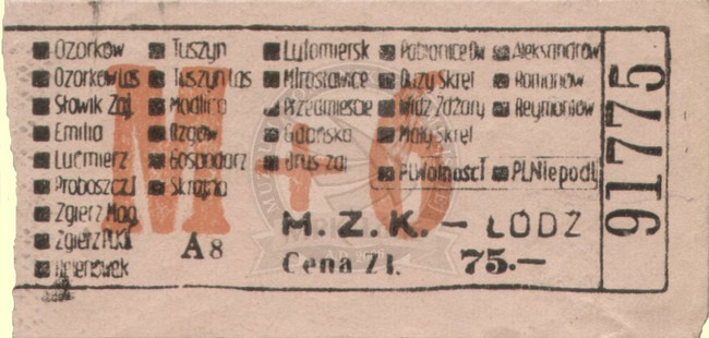 Bilet normalny jednorazowy na linię podmiejską do sprzedaży przez konduktora ważny na strefę miejską i sześć podmiejskich, nakład MZK - Łódź ze starą ceną 75 zł - cena: 5 zł.