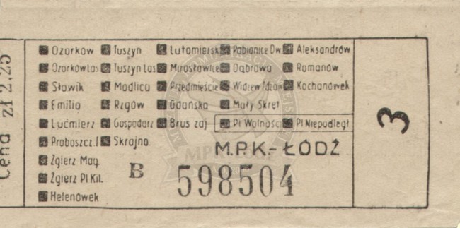 Bilet normalny jednorazowy na linię podmiejską do sprzedaży przez konduktora ważny na trzy strefy podmiejskie - cena: 2,25 zł.