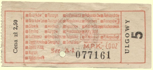 Bilet ulgowy jednorazowy na linię podmiejską do sprzedaży przez konduktora ważny na pięć stref podmiejskich - cena: 2,50 zł.