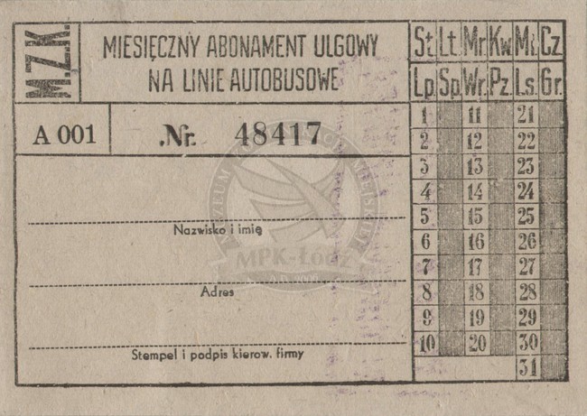 Abonament pracowniczy miesięczny ważny na linię Łódź - Nowosolna