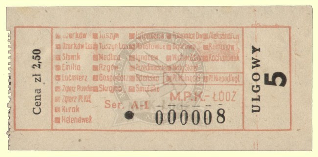 Bilet ulgowy na pięć stref podmiejskich do sprzedaży odręcznej przez konduktora w pociągu, cena: 2,50 zł.