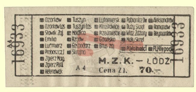 Bilet normalny na siedem stref podmiejskich do sprzedaży odręcznej przez konduktora w pociągu, z nadrukiem M.Z.K. i ceną nominalną 70 zł w cenie 5,25 zł.