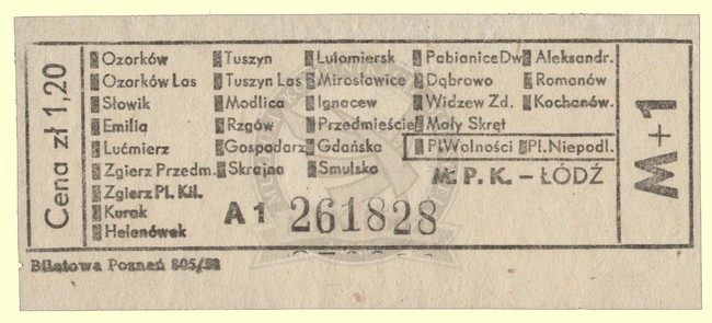 Bilet normalny na jedną strefę podmiejską i prawem przesiadania na linie miejskie do sprzedaży odręcznej przez konduktora w pociągu - cena: 1,20 zł