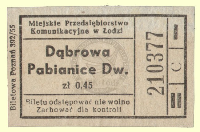 Bilet normalny na odcinek Dąbrowa - Pabianice Dworzec Kolejowy do sprzedaży odręcznej przez konduktora w cenie 0,45 zł.