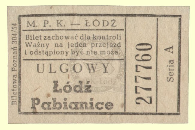 Bilet ulgowy na linię Łódź - Pabianice do sprzedaży odręcznej przez konduktora w cenie 1,30 zł.