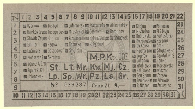 Bilet pracowniczy miesięczny na linie podmiejskie bez prawa przesiadania na linie miejskie ważny na 1 lub 2 strefy poza granicami miasta Łodzi /nakład z 1954 roku/ w cenie 9 zł