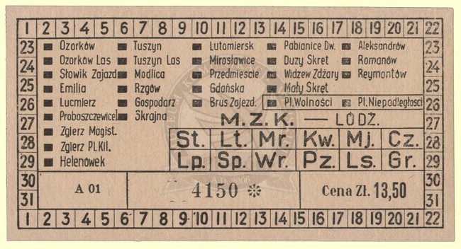 Bilet pracowniczy miesięczny na linie podmiejskie bez prawa przesiadania na linie miejskie ważny na 5 stref poza granicami miasta Łodzi /nakład z przed roku 1951 z nadrukiem M.Z.K. Łódź/ w cenie 13,50 zł