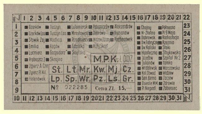 Bilet pracowniczy miesięczny na linie podmiejskie bez prawa przesiadania na linie miejskie ważny na 6 stref poza granicami miasta Łodzi lub odcinek miejski tramwaju podmiejskiego i 1 lub 2 strefy poza miastem /nakład z 1954 roku/ w cenie 15 zł