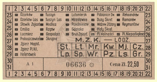 Bilet pracowniczy miesięczny na linie podmiejskie bez prawa przesiadania na linie miejskie ważny na strefę miejską tramwaju podmiejskiego i 7 stref poza granicami miasta /nakład z przed 1951 z nadrukiem M.Z.K. Łódź/ cena 22,50 zł
