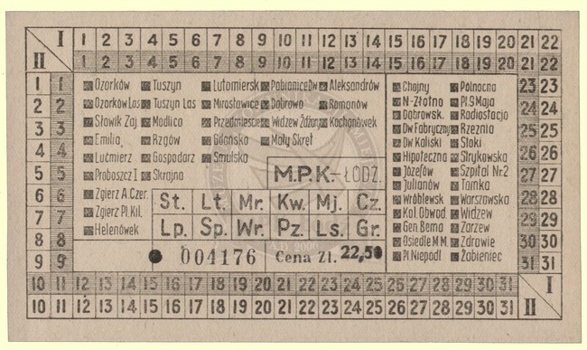 Bilet pracowniczy miesięczny na linie podmiejskie z prawem jednokrotnego przesiadania na linię miejską tramwajową lub autobusową. Bilet ważny na siedem stref poza granicami miasta z prawem przesiadania na linię miejską. Cena 22.50 zł